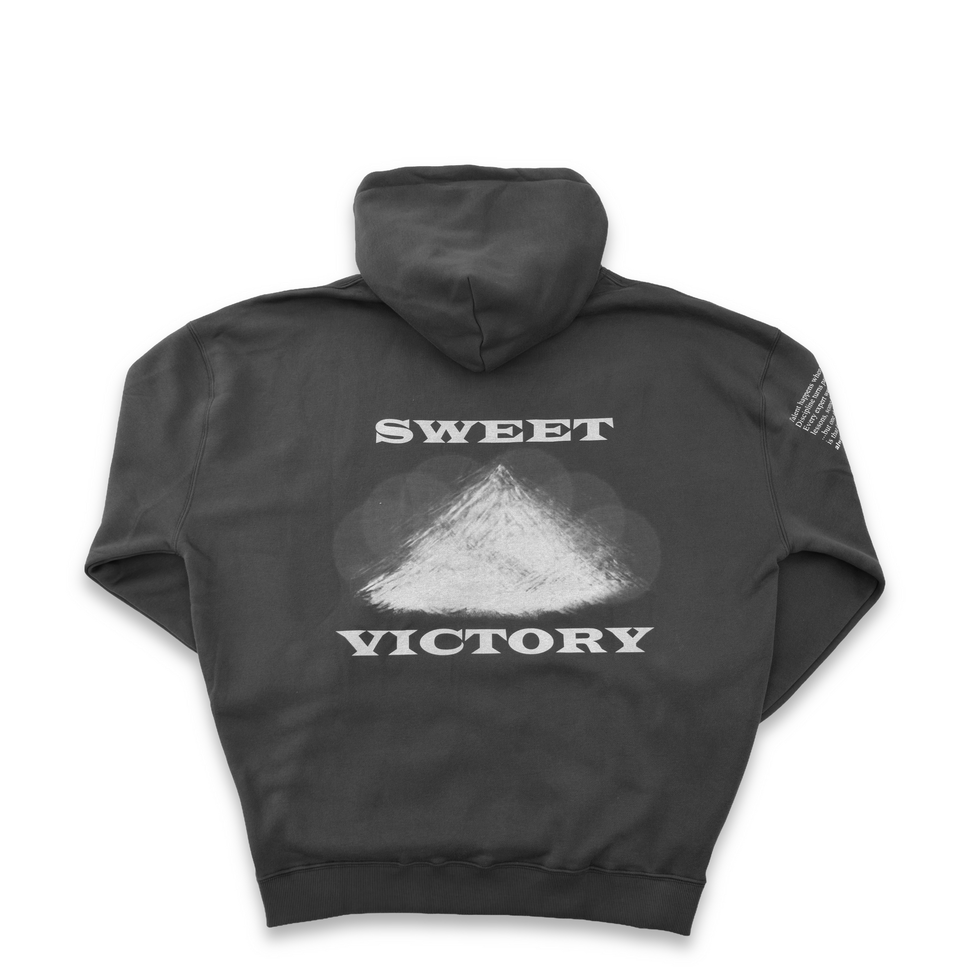 VOWLAR – SWEET VICTORY - a dark grey thick oversized hoodie for the daily grind. Crafted from a premium 400GSM fabric blend, it delivers soft comfort with lasting durability, featuring ribbed cuffs and hems to maintain a solid, boxy structure. Featuring SWEET VICTORY artwork on the back, extended sleeve quotation, and front-facing statement “long roads make victory sweeter”, the piece captures creativity with willpower and commitment.